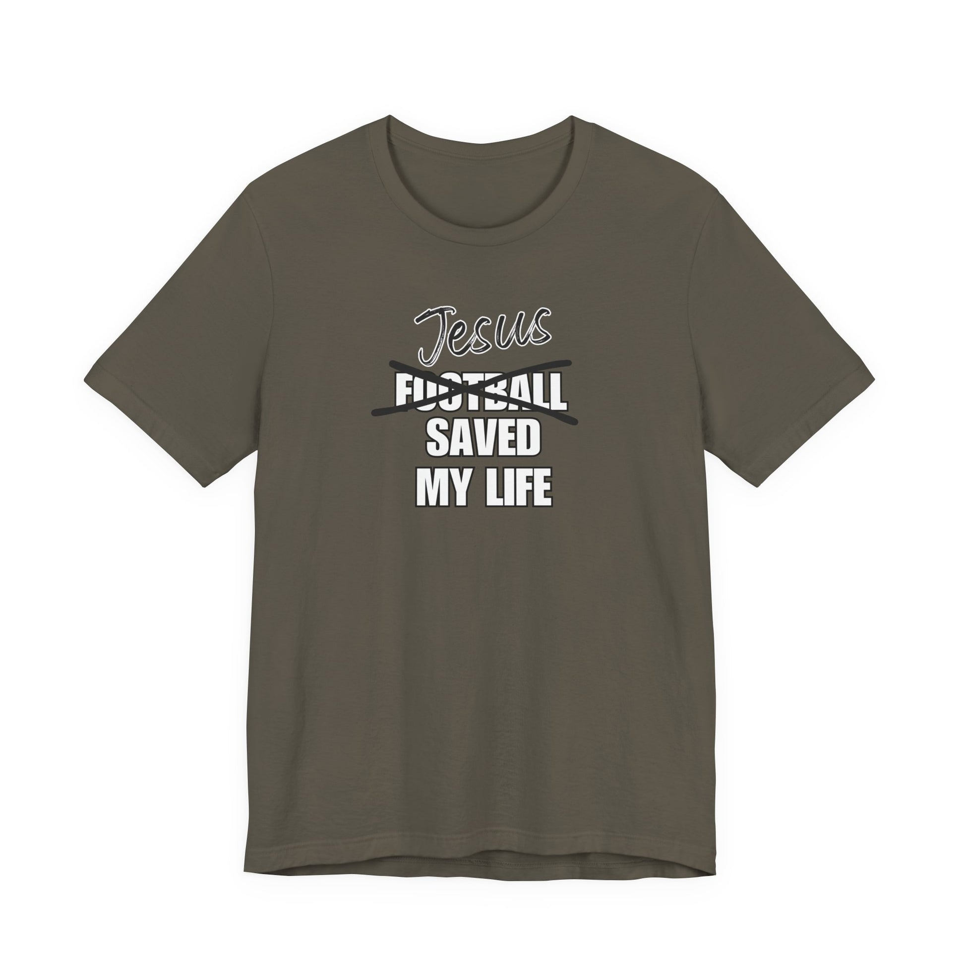 A Jesus Saved My Life- Football T-shirt unisex combines faith and sport in a stylish design. Perfect for football enthusiasts who want to show their love for both Jesus and the game. Available in a variety of colors and sizes.