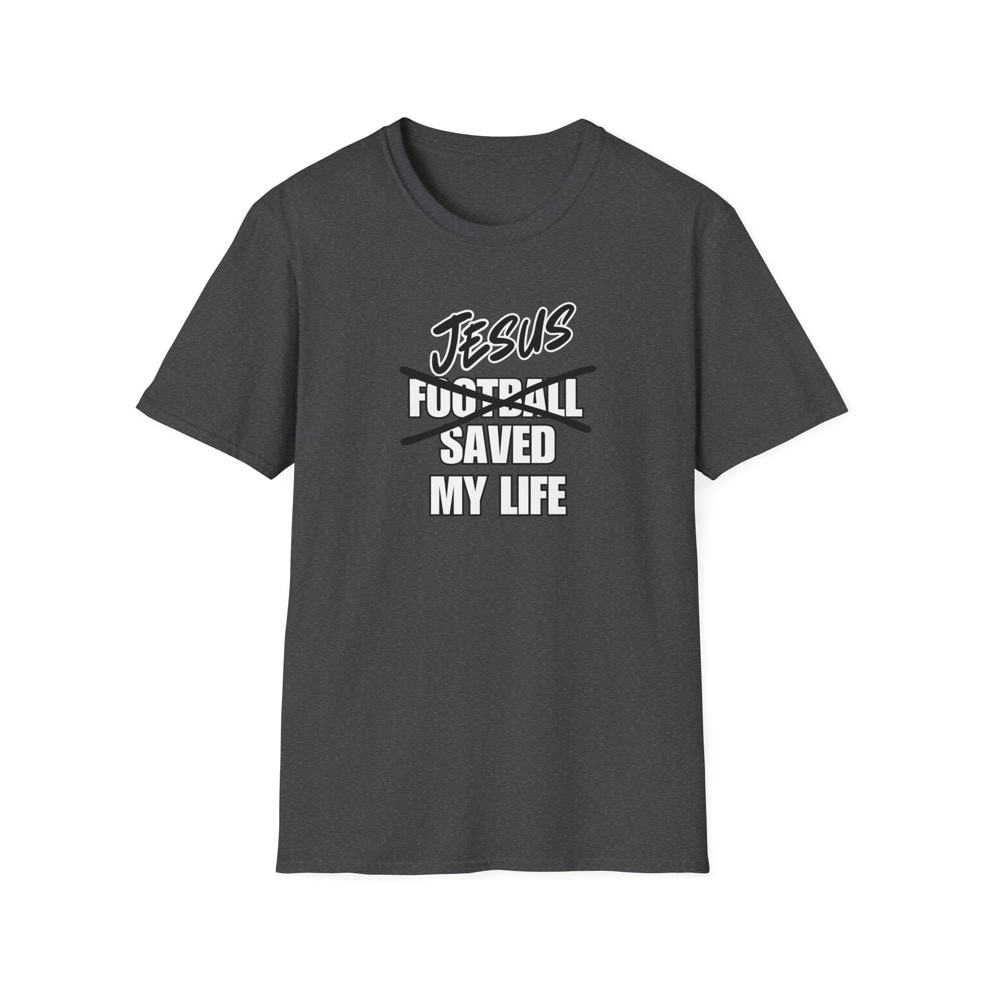 A Jesus Saved My Life Football T-shirt that combines faith and sport in a stylish design. Perfect for football enthusiasts who want to show their love for both Jesus and the game. This unisex T-shirt is available in a variety of colors and sizes, making it a versatile addition to anyone's wardrobe. Ideal for Christians as well as football fans who want to showcase their passion for Jesus and the game.